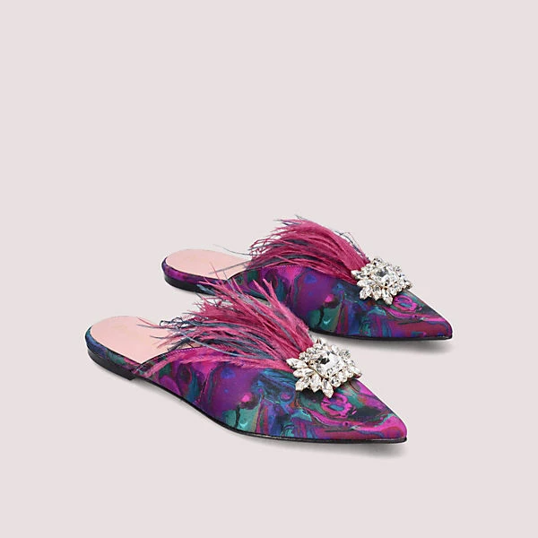 – Pantolette Ella mit spitzer Kappe aus mehrfarbig bedruckter Seide mit Swarovski-Brosche und Straußenfedern, Sohle, Innenfutter und Decksohle aus Leder